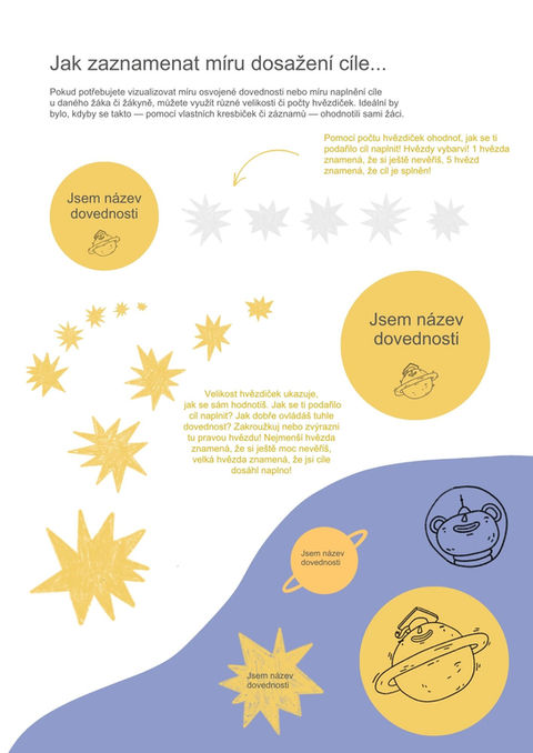Také se samotnými mapami můžete pracovat různě: můžete třeba pověsit na nástěnku naši "předlohu" a vyzvat žáky, aby si sami namalovali svůj poster, do nějž pak budou své splněné etapy zakreslovat. Každý žák si tak může namalovat svůj vesmír, les, zahradu nebo moře. Co myslíte, jak by to mohlo nejlépe fungovat pro vaši třídu?